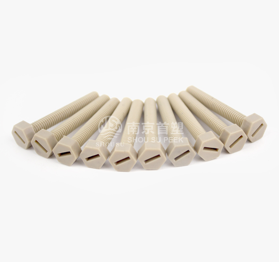 PEEK bolts can be formed in one time by mans of injection technology, in which the processing cost is low, and the price is superior. It is more corrosion resistant than metal screws, and featured with non-rusty property, light weight, high temperature resistant, excellent electrical performance, and irradiation resistance. Large inventory available all year round. Nanjing Shousu produces PEEK screws of the following specifications: